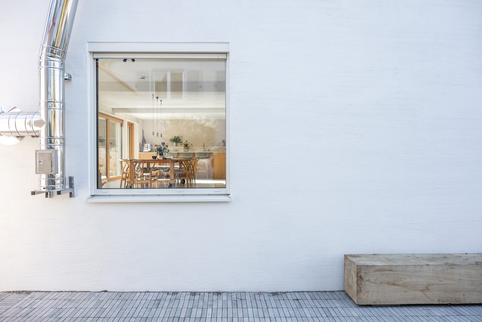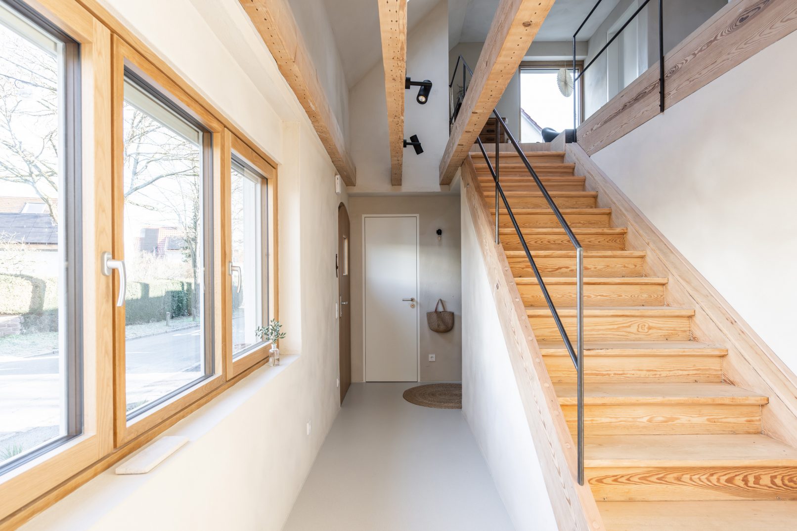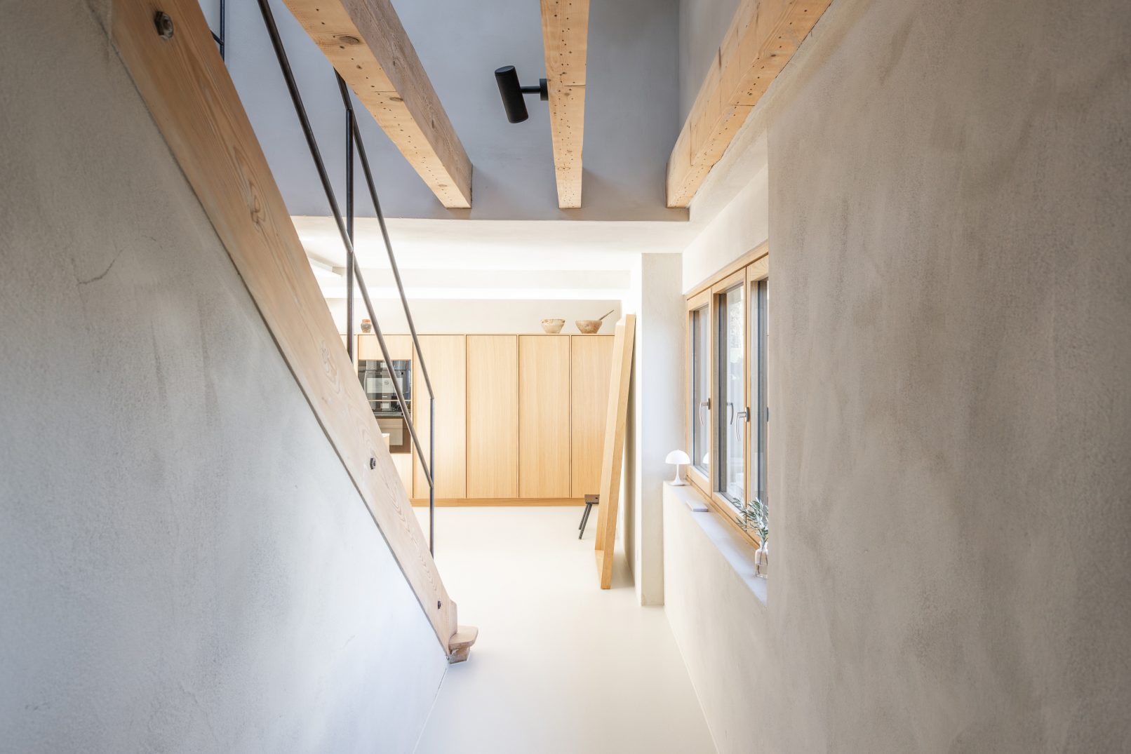 the large eat-in kitchen, with its tasteful, white-oiled oak cabinets and the kitchen island, creates a warm contrast to the light, rough lime plaster walls and the smooth cast floor, which covers the entire level. the dining area, as the central focus in the room, provides ample space for the entire family. the new, built-in fireplace, outfitted with an adjoining bench and square panoramic window, invites people to linger. exposed old wooden beams and a renovated wooden staircase to the upper floor reveal the structure’s history.