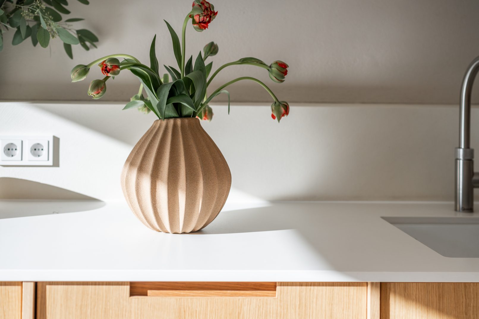 durch das gesamte projekt ziehen sich naturbelassene und schlichte materialien, die den raum harmonisch miteinander verbinden. die rauen, abgetönten kalkputzoberflächen im gesamten haus lassen wände, decken, vorbauten und den kamin ineinander verschmelzen. der gussboden im erdgeschoss, gefertigt aus natürlichen biopolymeren, lebt von den kleinen eingearbeiteten steinchen. die schlichten, eleganten eichenholz-aluminiumfenster wirken wie bilderrahmen, die den blick auf die natur freigeben. die gebäudehülle wird durch ein dach mit dunkelroten ziegeln, dunkelbraune blechverkleidungen an den gauben und eine fassade aus kalkputz in besenstrich geprägt. historische fenstersimse und türumrahmungen aus rotem stein ergänzen das gesamtbild.