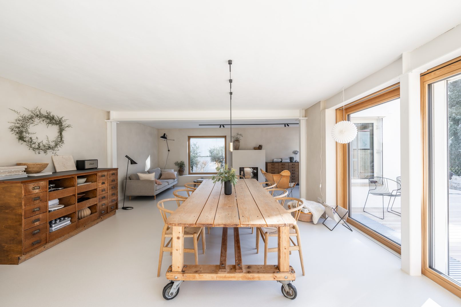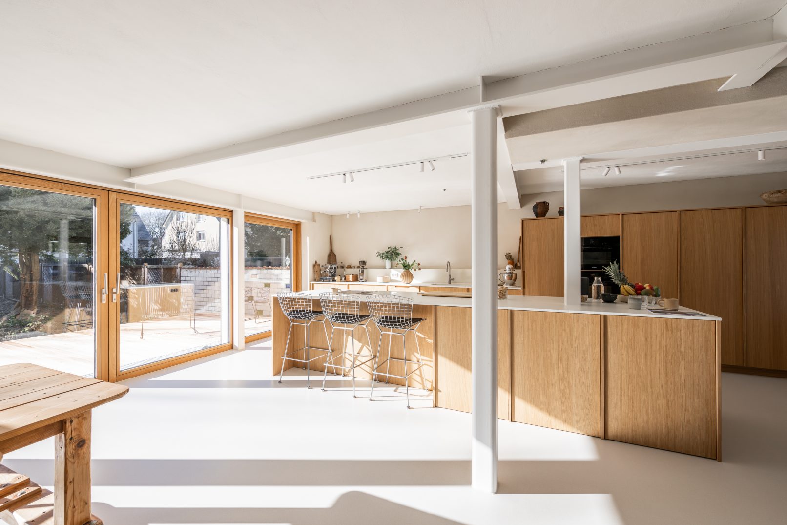 die große wohnküche aus dezenten, weißgeölten eichenschränken und einer kücheninsel bildet einen warmen kontrast zu den hellen, rauen kalkputzwänden und dem glatten gussboden, der sich durch die gesamte etage zieht. der essbereich, als zentraler punkt im raum, bietet platz für die ganze familie. der neue einbaukamin mit angrenzender sitzbank und quadratischem panoramafenster lädt zum verweilen ein. freigelegte alte holzbalken und die aufbereitete holztreppe ins obergeschoss erzählen von der geschichte des gebäudes.