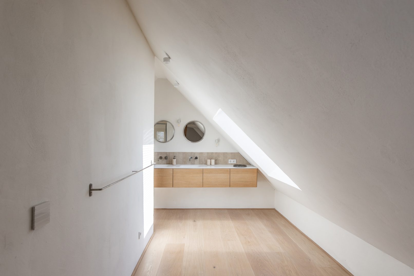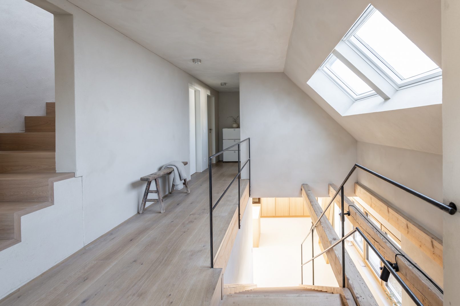 on the upper floor, three children’s rooms, a spacious bathroom and new access to the attic have been created by restructuring the rooms and doubling the size of the bay window horizontally. a folding staircase, made of oak planks and integrated into the overall appearance, leads up to the attic, which has been converted into a bedroom with an open bathroom. a wide dormer window on the south side opens up the space and ensures a pleasant ceiling height. continuous oak floorboards in all rooms and hallway cleverly emphasize both the depth and length of the building. a floor-to-ceiling window in the hallway, as well as new skylights on the upper floor and in the attic, flood the space with light. here too, the exposed old wooden beams and supports effectively accentuate the structure’s historical elements.