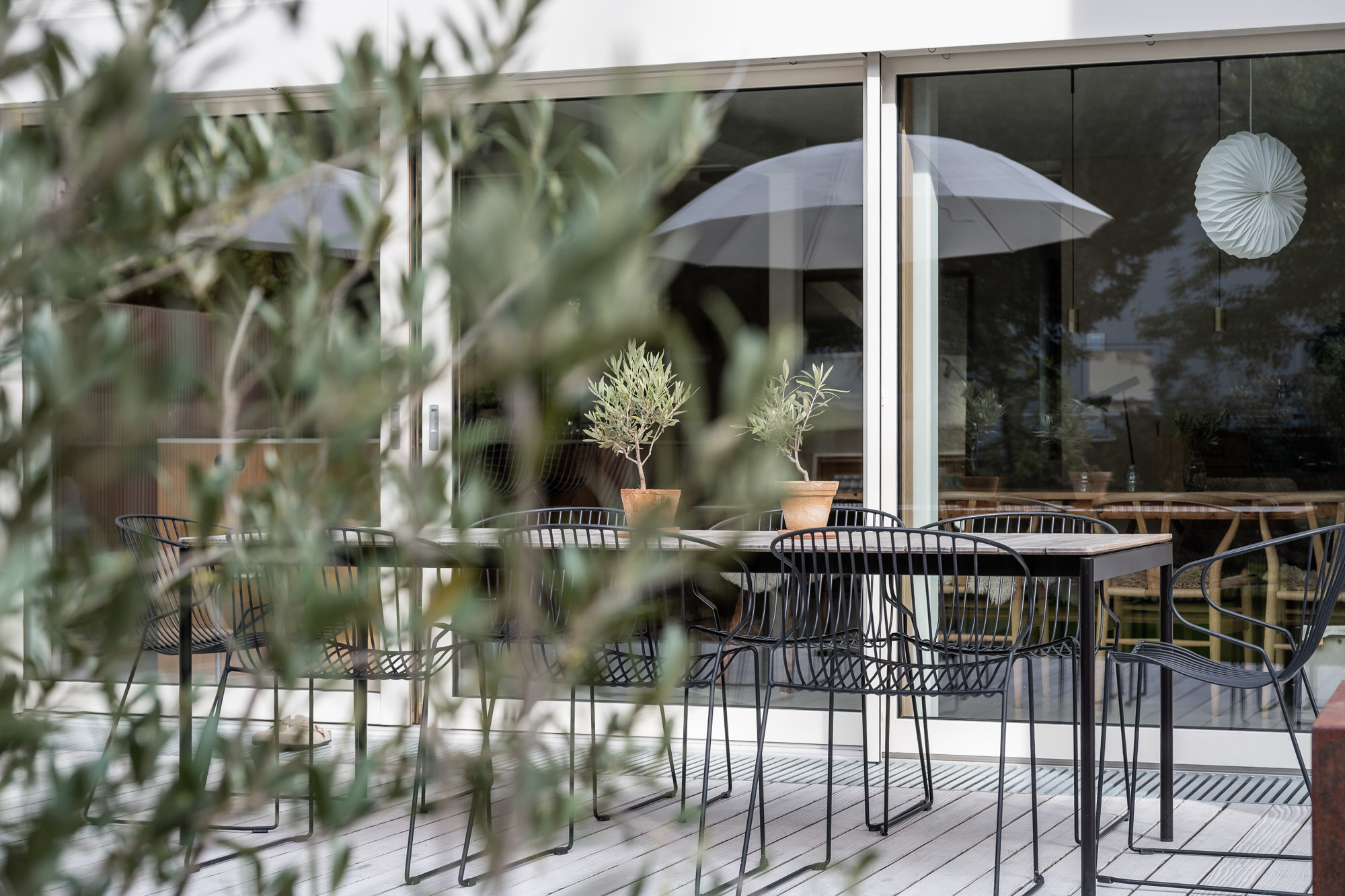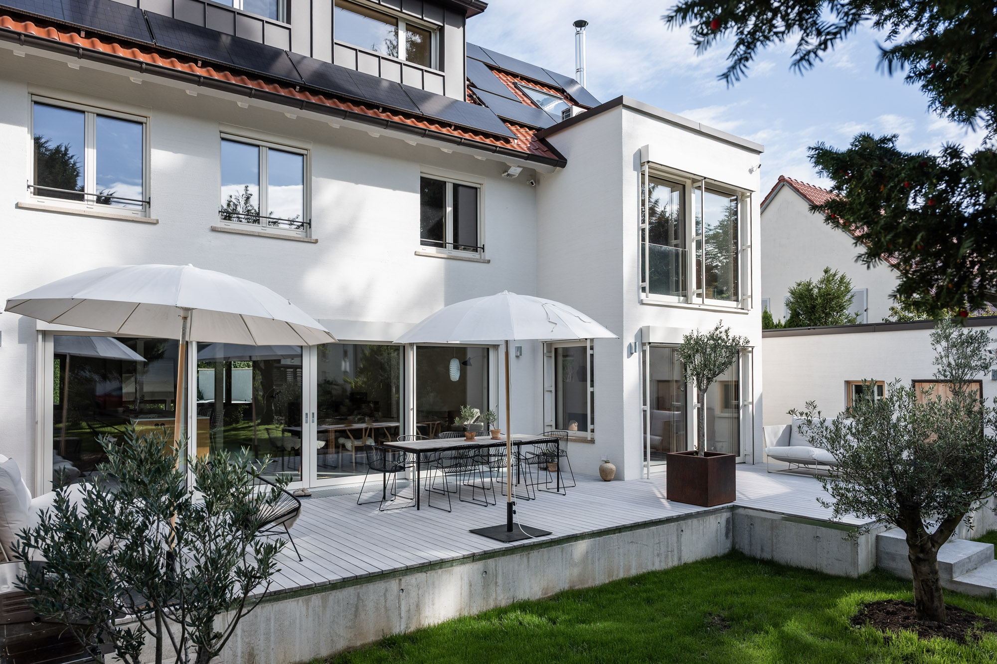 on the first floor, the walls that had previously divided the living area into small, separate spaces were removed. now, a new steel structure allows for an open, interlocking design and a single space that extends to the roof level. a large glass facade, which lets plenty of light into the center of family life, is complemented on the exterior with a raised terrace that extends the living space into nature.