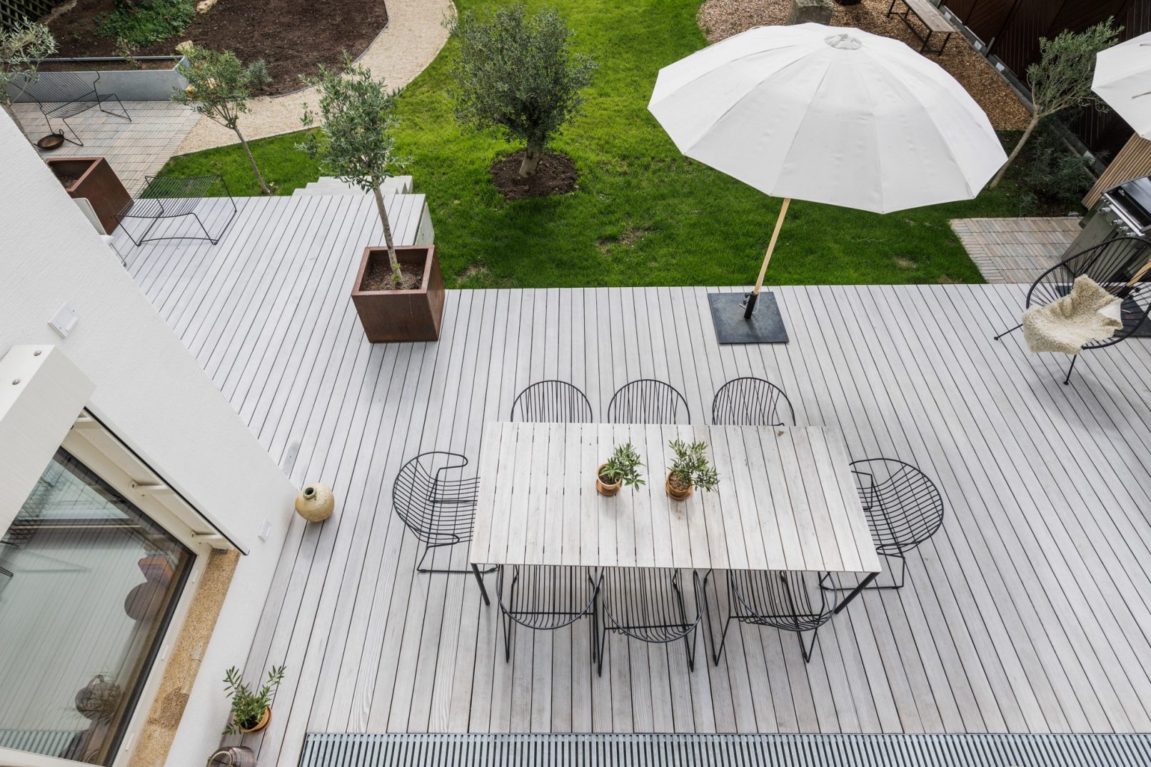 im erdgeschoss wurden sämtliche wände entfernt, die den wohnbereich zuvor in kleine, voneinander getrennte zimmer unterteilt hatten. nun ermöglicht eine neue stahlkonstruktion eine offene, ineinandergreifende gestaltung und einen luftraum, der sich unter die dachebene zieht. eine große glasfront, die viel licht in den mittelpunkt des familienlebens bringt, wird im außenraum begleitet von einer erhöhten terrasse, die den wohnraum in die natur erweitert.