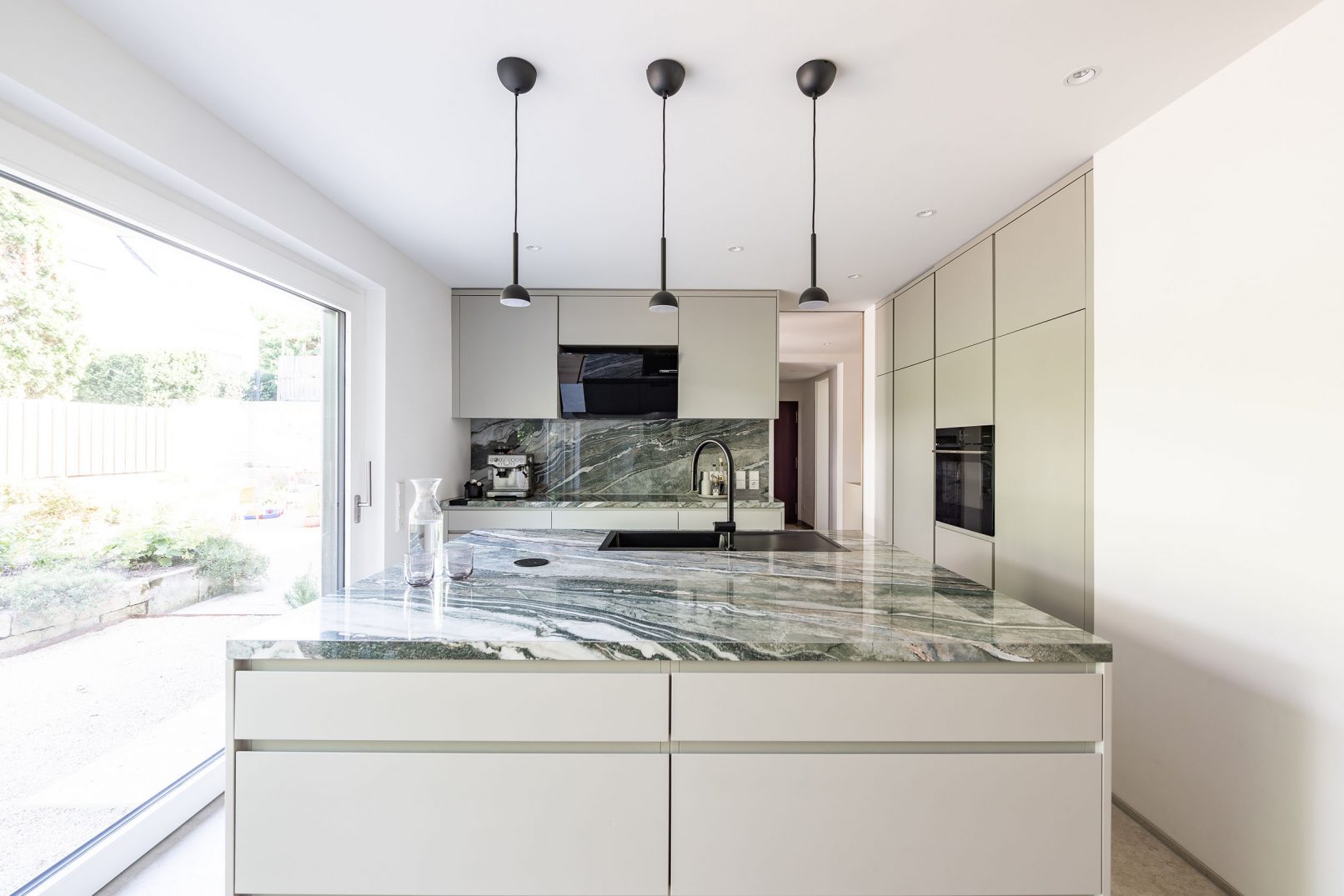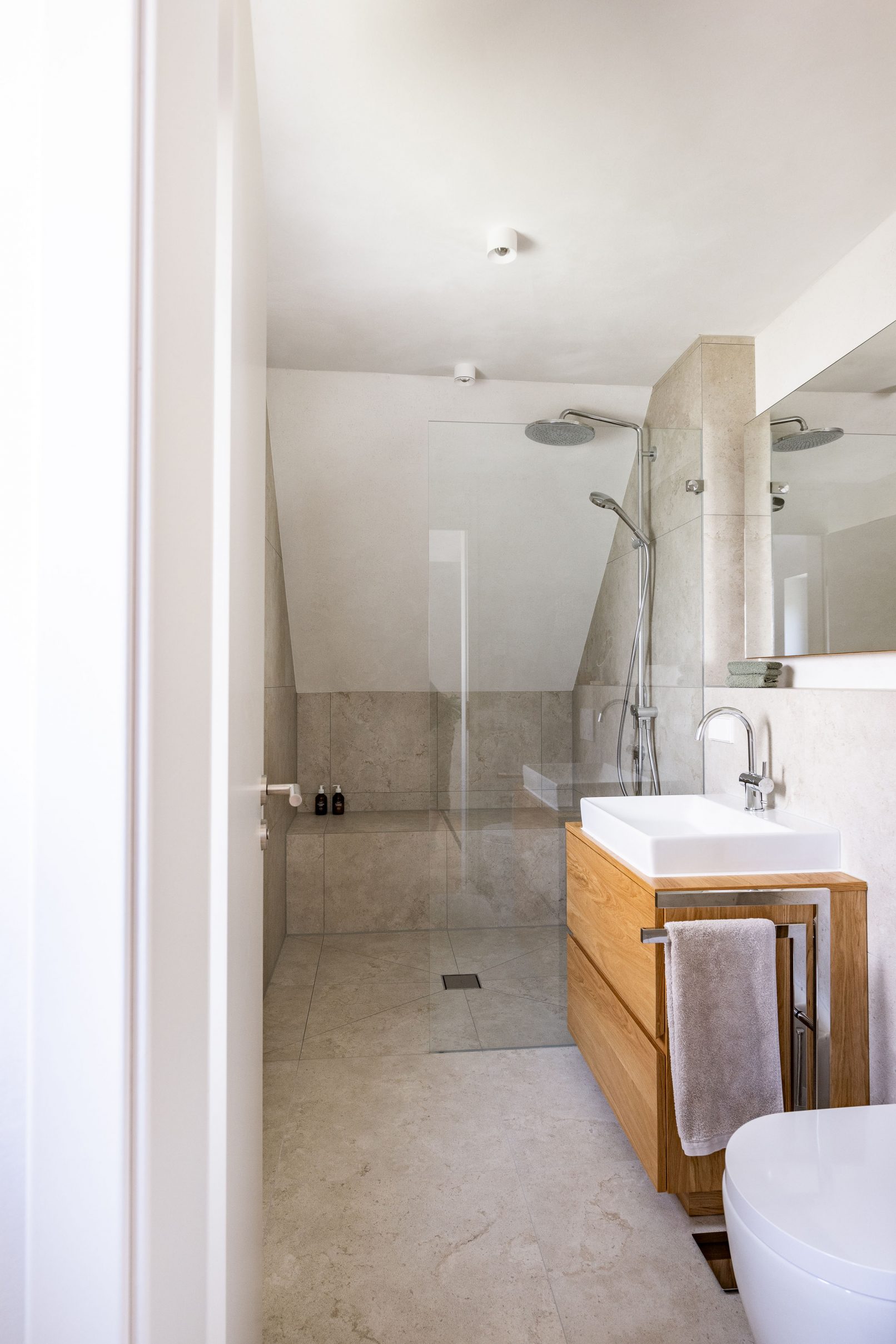 die materialwahl folgt einem klaren gestalterischen konzept. im gesamten wohnbereich wurde eichenparkett verlegt, der dem raum eine ruhige, warme grundstimmung verleiht. in küche und bädern sorgen großformatige travertinfliesen für ein robustes und zugleich elegantes erscheinungsbild. mamorkalkputz in unterschiedlichen strukturen auf wand- und deckenflächen verleiht den innenräumen eine zurückhaltende tiefe und angenehme haptik. akzente setzen grüne marmorelemente in der küche sowie dunkelgrüne wandfliesen im gäste-wc.