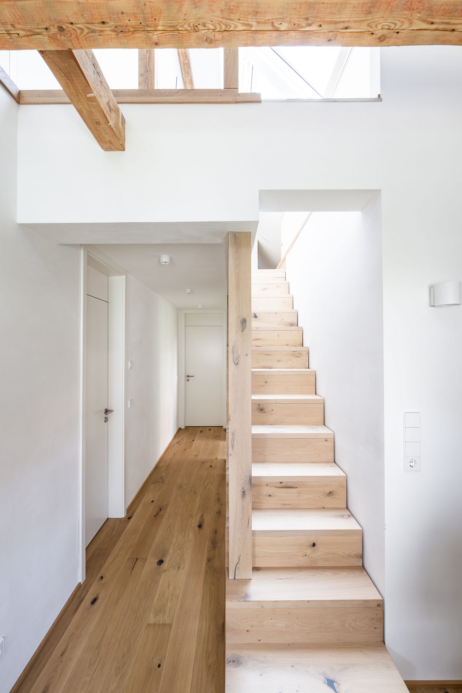 das dachgeschoss wurde ausgebaut und als eigenständiger gäste­bereich mit offener galerie nutzbar gemacht. sichtbar belassene dachbalken erhalten den charakter des hauses, während eine schmale treppe aus eiche mit integriertem stauraum die erschließung elegant löst.