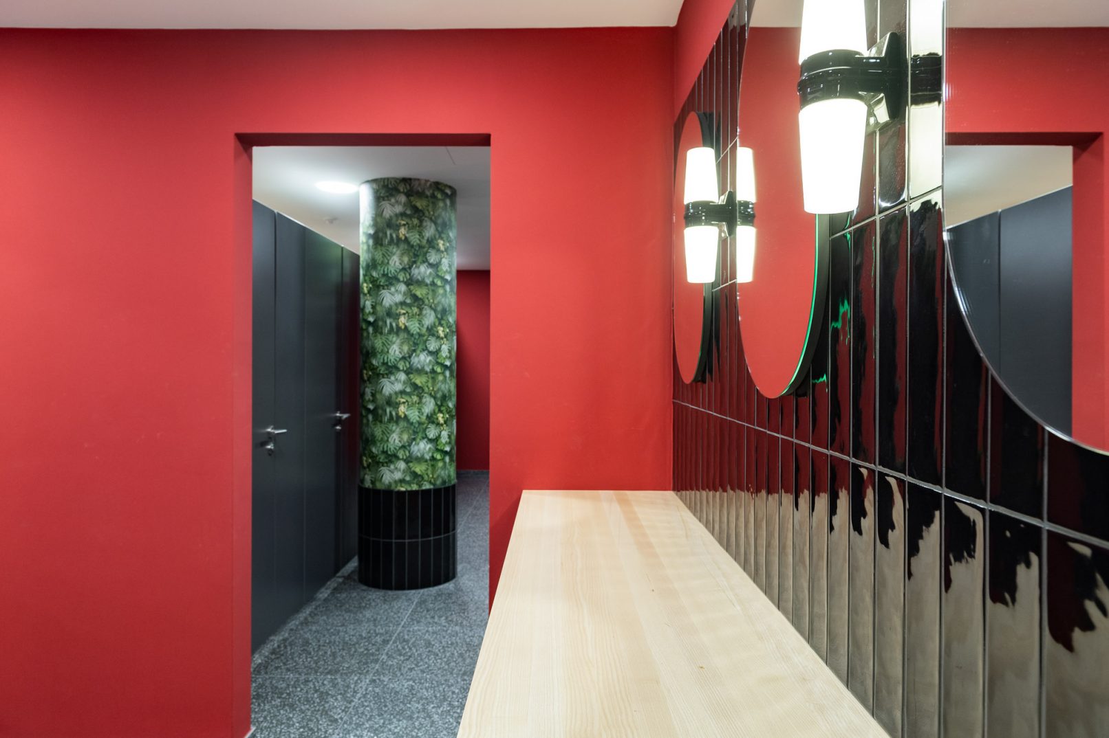 We choose festivity with function. Rather than patching up here and there or replacing one element with another, we rethink and redesign entirely. Shades of red, generous mirror surfaces, subtle ambient lighting. Columns wrapped in deep green wallpaper, sleek black-gloss vertical tiles, and generously sized mirrors with integrated soap and paper dispensers. Complemented by calming, rich wood—covering the washbasin and doubling as shelving at the vanity stations. The restrooms for women, men, and the accessible cabin now exude warmth, elegance, serenity, and timelessness. They welcome gala guests just as they do chamber concert audiences, congress attendees, breakout session participants, and exhibition visitors alike.