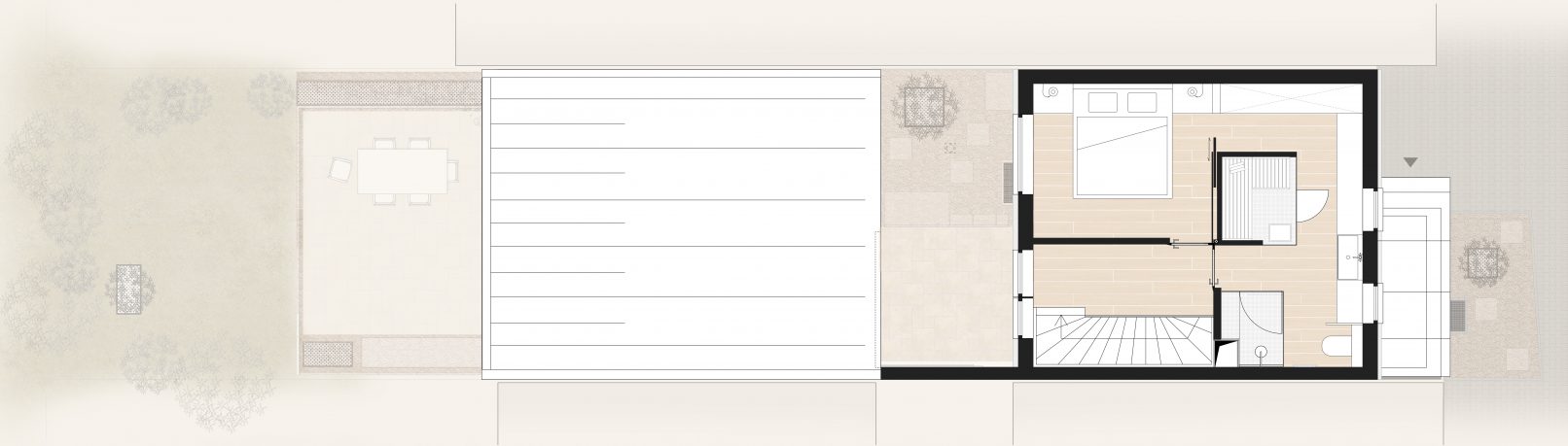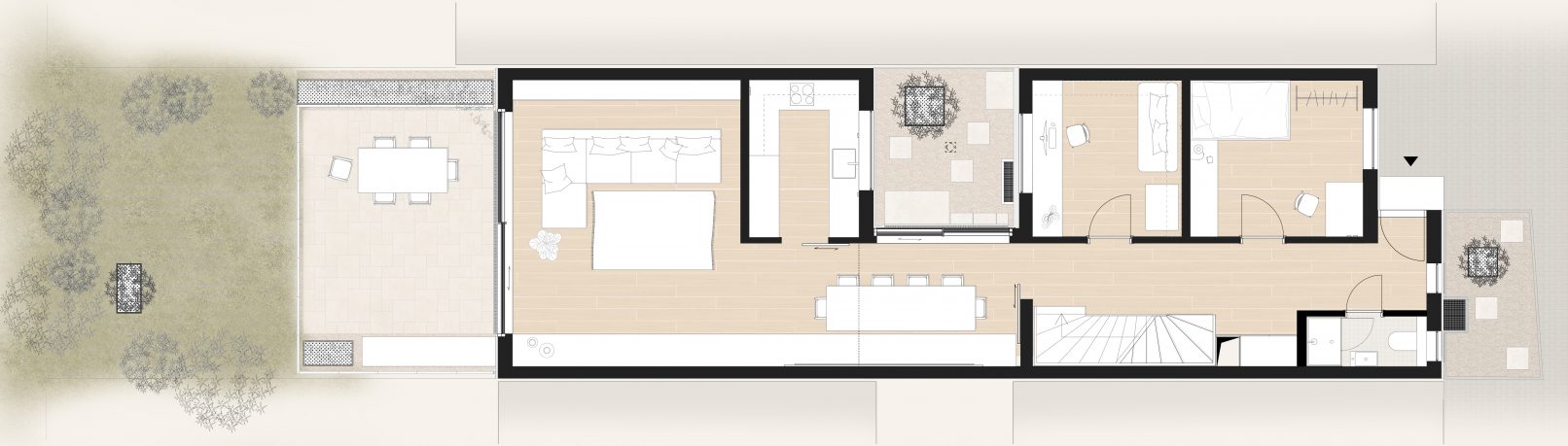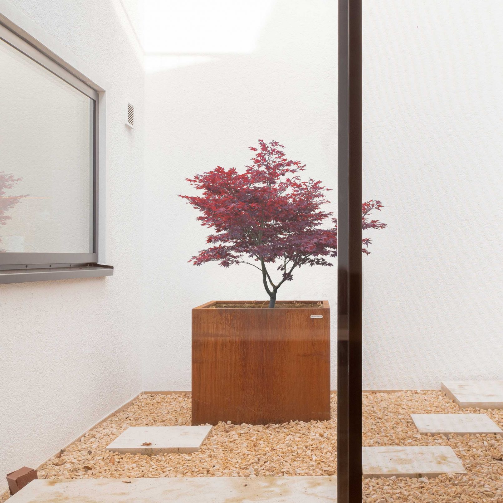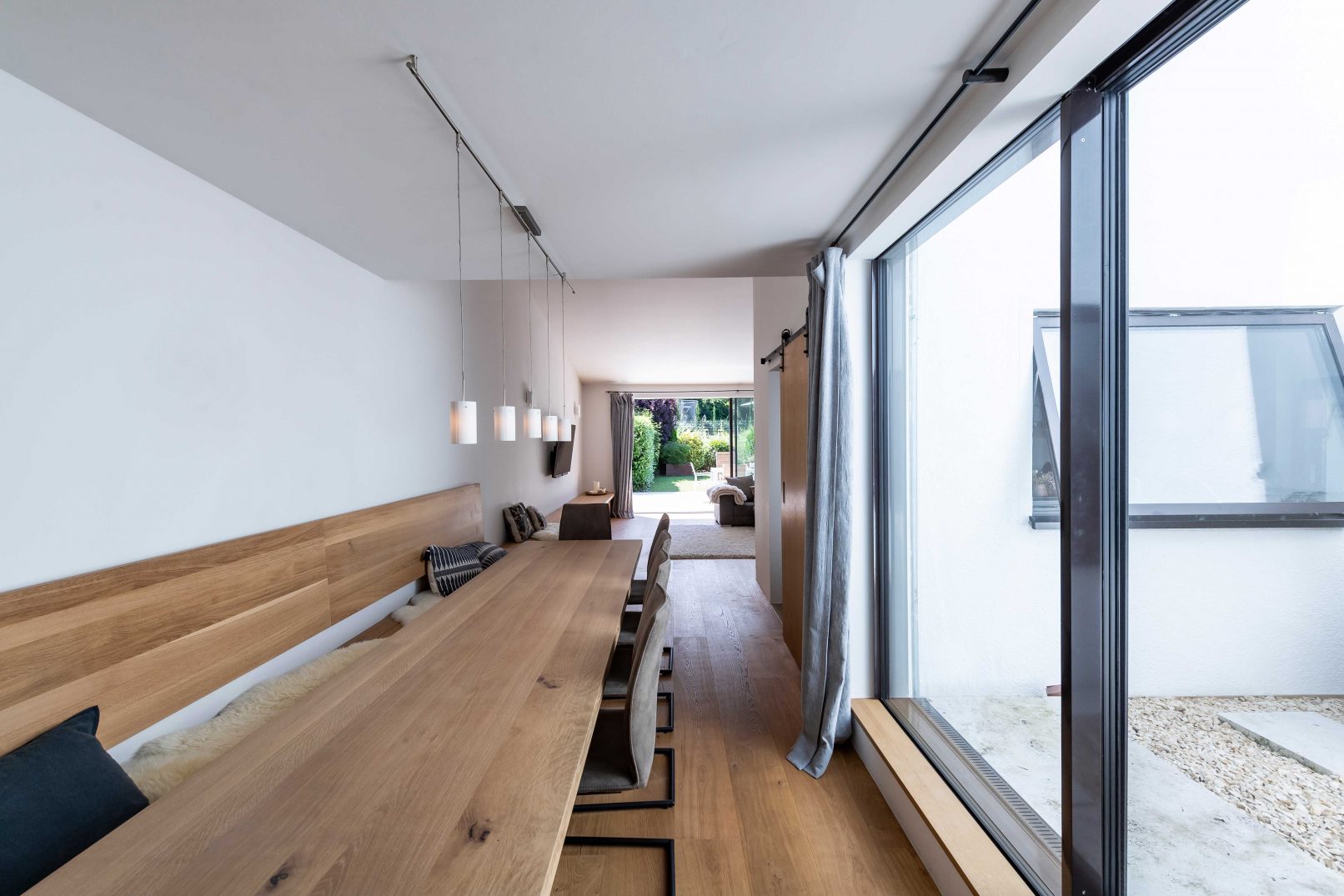 beim betreten des ess- und wohnbereichs weitet sich der raum und wird mit licht durchflutet. ausschlaggebend ist hierfür ein atrium, welches den essbereich, küche und arbeitszimmer unerwartet im inneren des gebäudes mit tageslicht versorgt. durch eine kleine stufe kann man hinauf und hinaus in das atrium treten, ein neu angelegter steingarten mit lose knirschendem schotter und einzelnen festen trittsteinen aus travertin. im zentrum befindet sich ein japanischer zierahorn welcher dem ort noch mehr fokusierung verleiht. die raumhohe sowie rahmenlose schiebeverglasung lässt diesen ort der ruhe ins innere des hauses strömen.