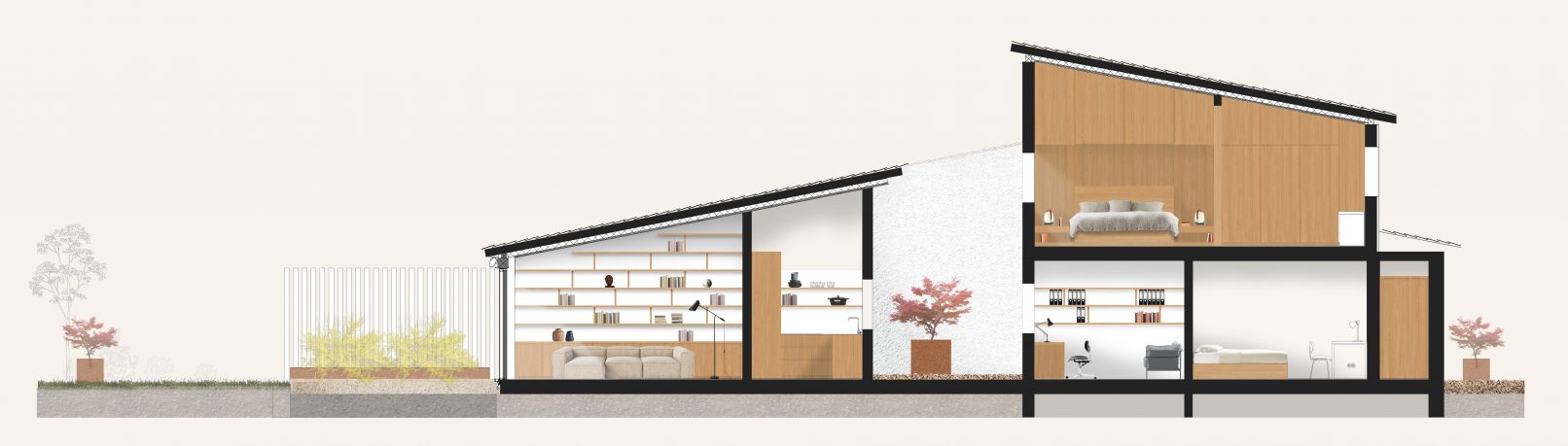 upon entering the dining and living area, the space widens and is being flooded with natural light. that’s because of an atrium, which provides the kitchen, office and dining area unexpectedly with daylight. through a small step, one can step up and out into the atrium, a newly built stone garden with loosly crunching pebbles and fixed single stone tiles out of travertine. in the center there is a japanese maple, which provides the space even more focus. the ceiling-high and frameless glass sliding doors allow the sanctuary to stream inside.