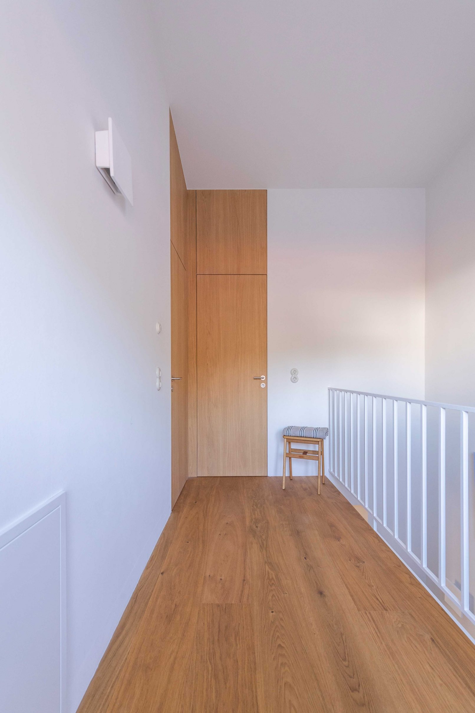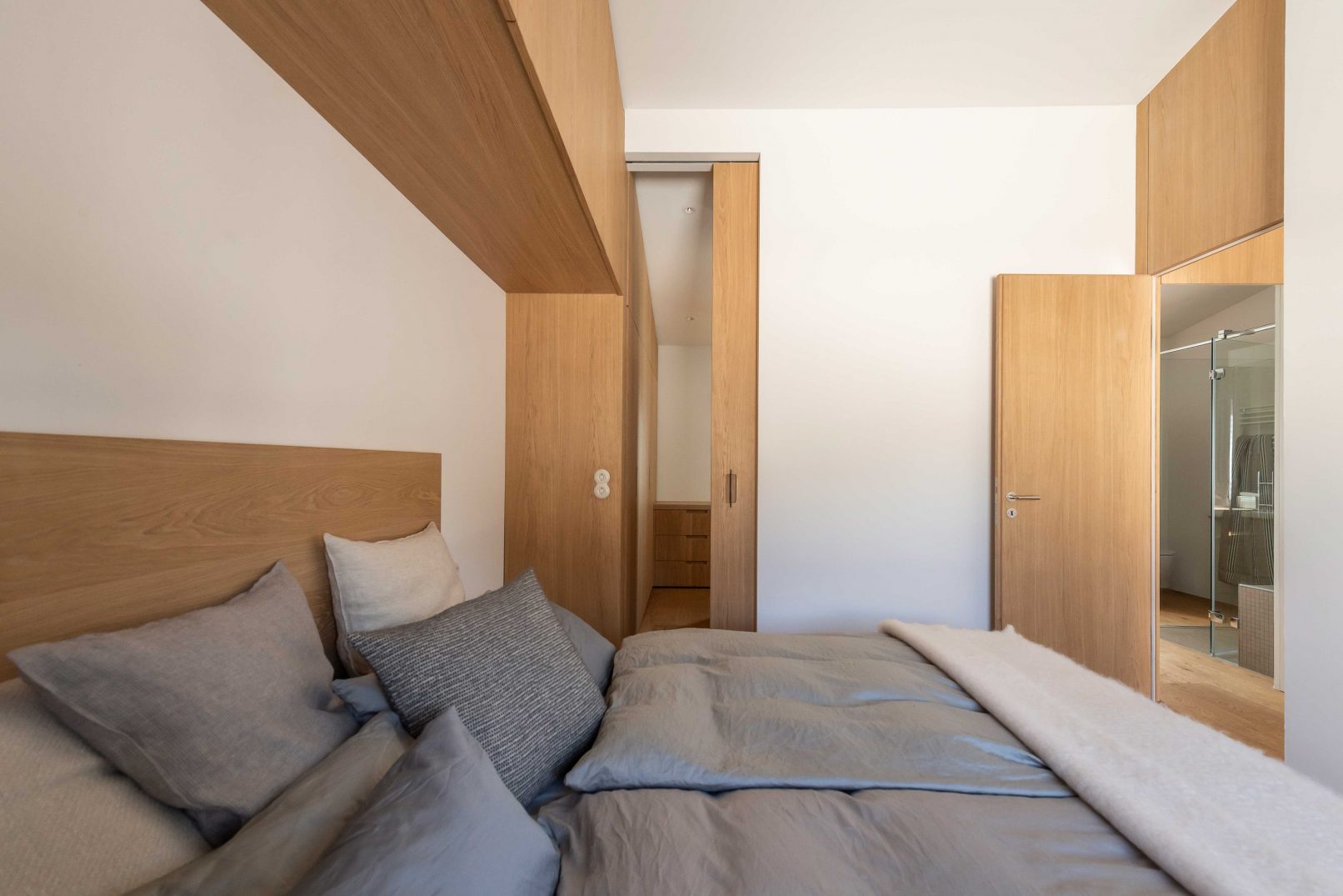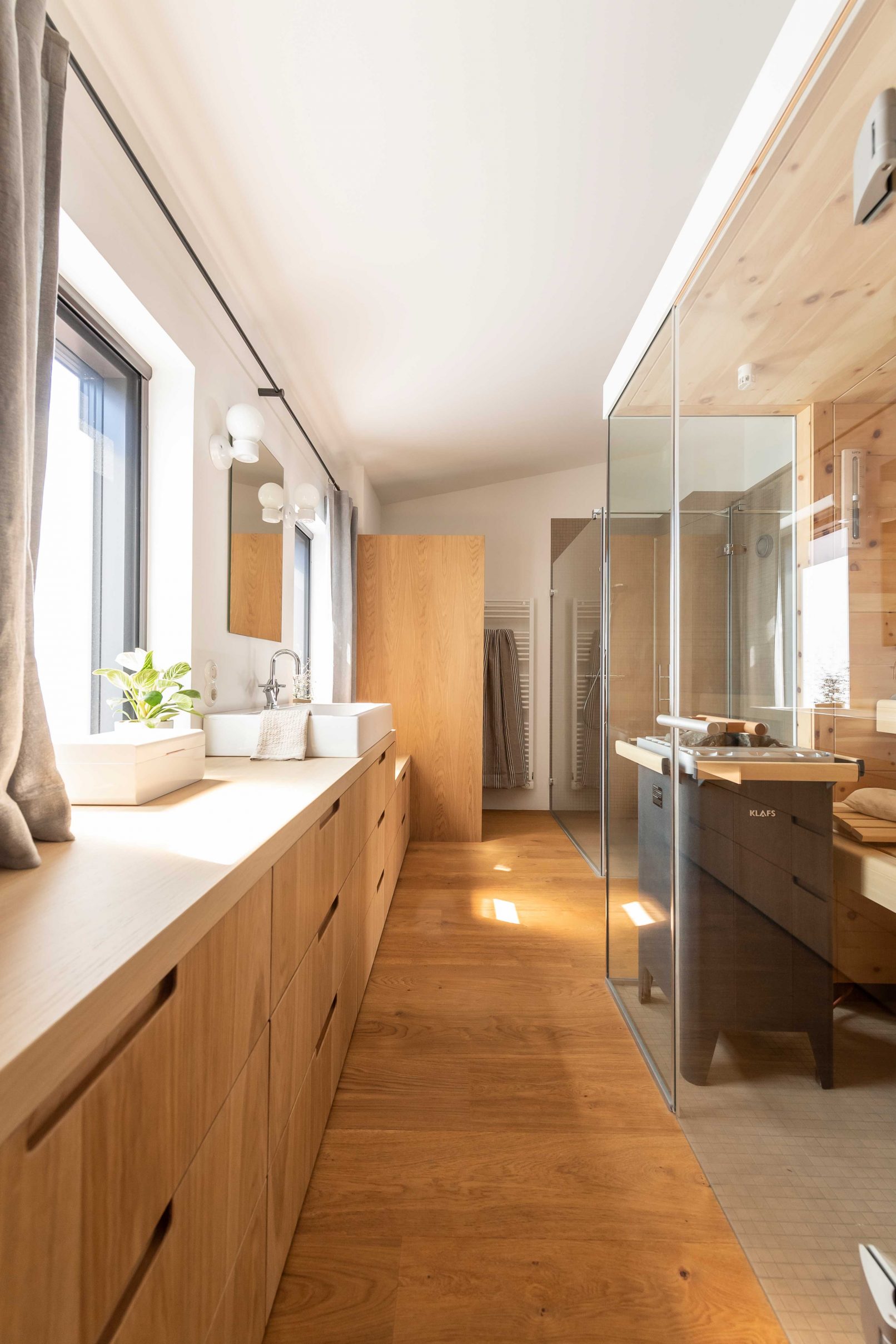 im obergeschoss befindet sich der schlaf- und wellnessbereich. anstelle einer auf der ost-west achse stehenden wandscheibe befindet sich heute ein zentraler knotenpunkt aus einem komplexen türdetail und einer monolithischen raumskulptur – der sauna. diese steht mittig im raum und zoniert die bereiche darum – der übergleitende raum aus schlafbereich und wellness-bad umfließt den sauna-monolithen. die raumhohen türelemente mit ihren eingeputzten zargen verstärken den effekt durch ihrer filigranität, geben dem ensemble eine verspielte leichtigkeit und lassen die sauna im zentrum wirken.durch das ganze projekt ziehen sich schlichte, detailliert ausgeklügelte schreinereinbauarbeiten und möbel und architektur verschmelzen. das leicht weiß geölte eichenholz gibt den räumen eine ausstrahlung von schlichter eleganz, wärme und dauerhaftigkeit und bildet einen akzent zu dem naturgeölten holzboden. die verwendung rohen stahls an den schiebetürbeschlägen, dem esstisch und den vorhangstangen kontrastiert mit der einheit des eichenholzes und bringt gelassene lebendigkeit ein.
