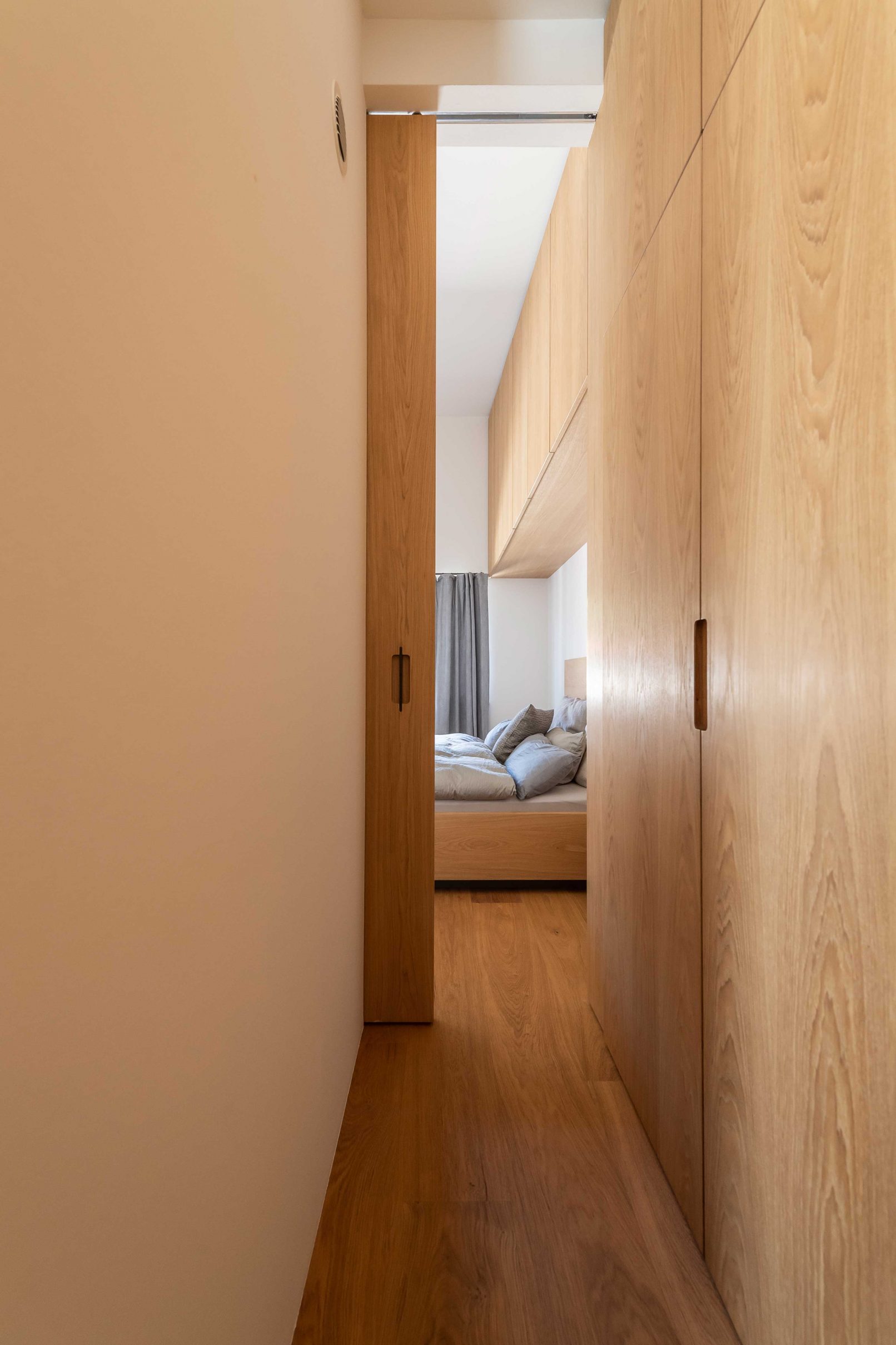 On the upper floor, the bedroom and wellness area are located. Instead of a brick wall on the east-west achsis, there is now a central junction of a complex door detail and monolithic spatial sculpture – a sauna. The sauna is being built centrally into the space and is structuring the areas around it – the transient space of sleeping area and wellness bathroom flows around the „sauna monolith“. The skinny, ceiling high door elements, with wall-integrated frames, reinforce that effect and award the ensemble with a playfull lightness, and orchestrate the sauna in their center.