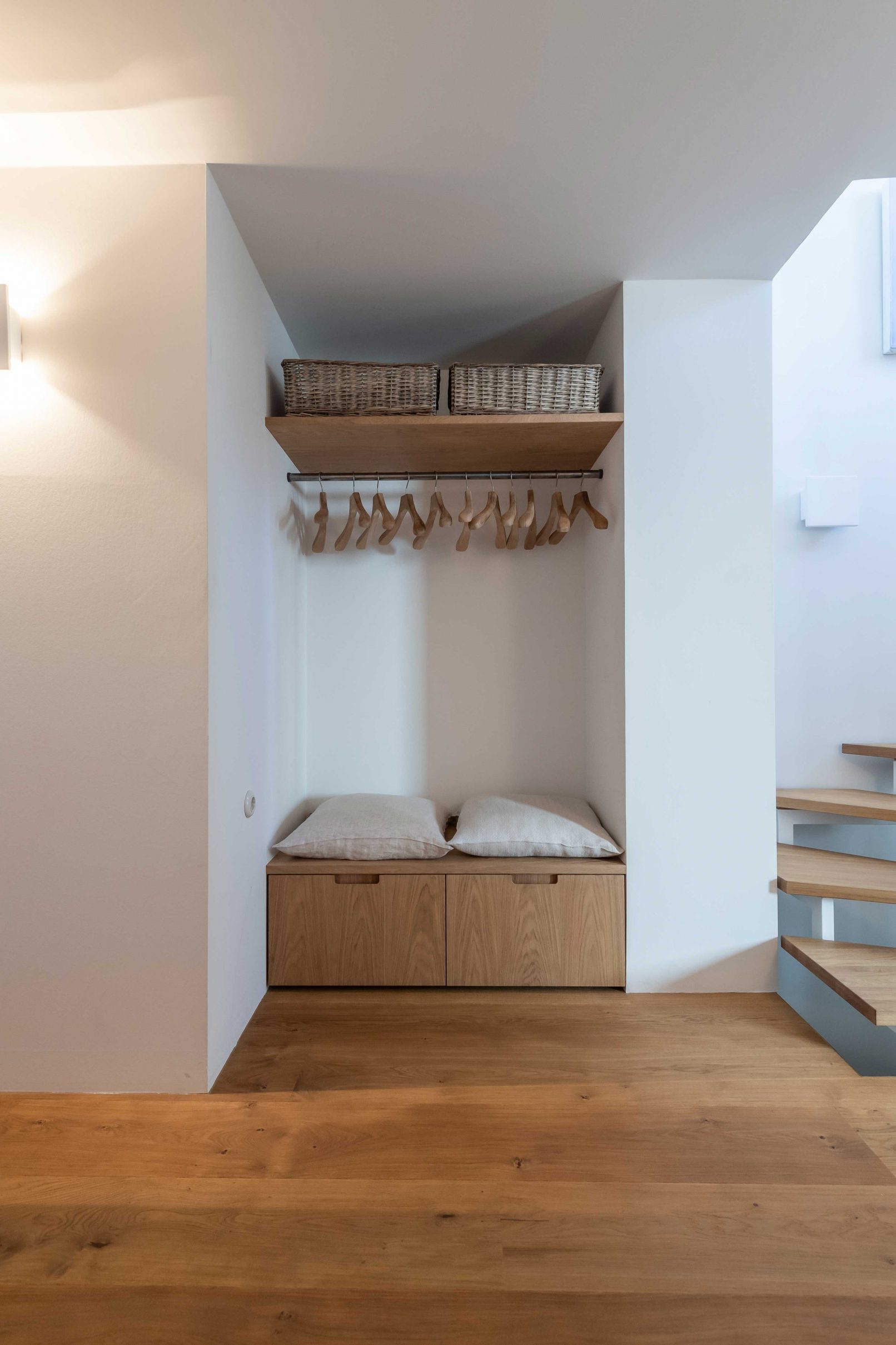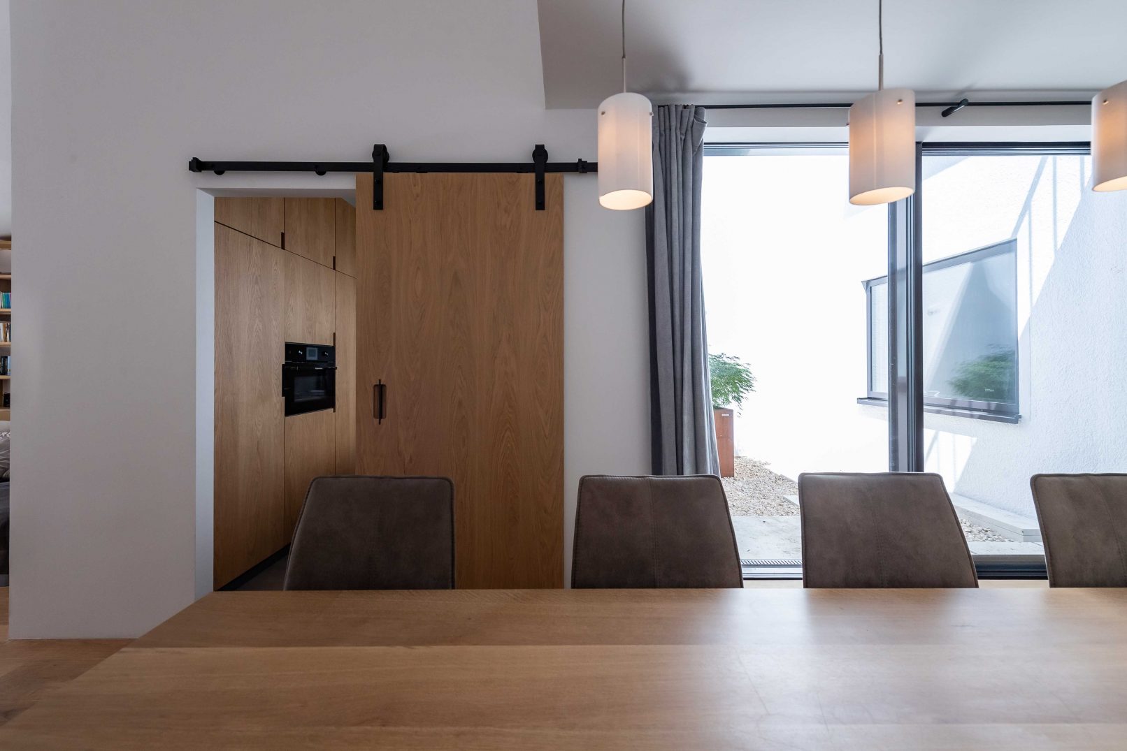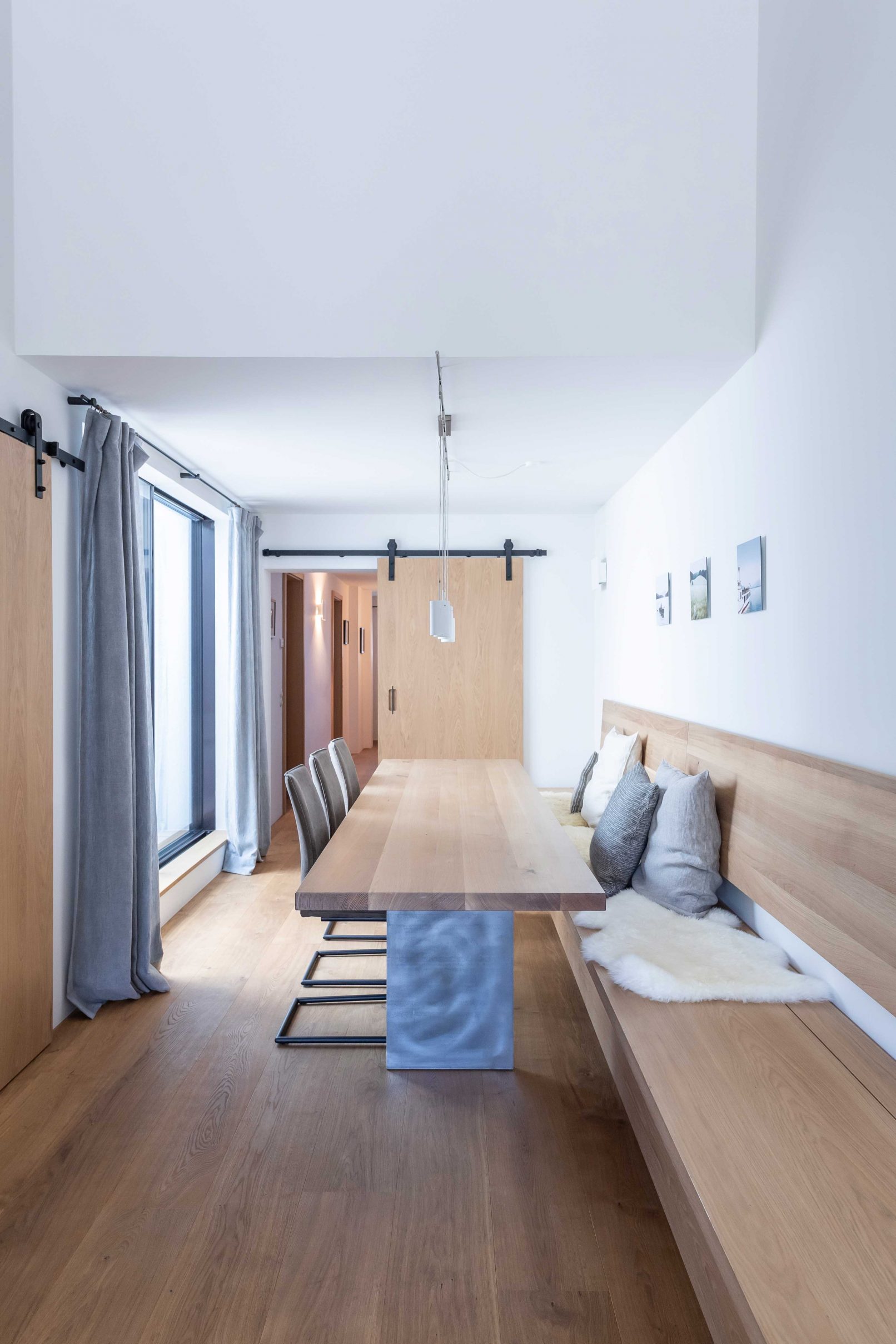 Throughout the entire project, puristic and detailed woodwork blends with the architecture. The oiled oak with a subtle white pigment creates the air of simple elegance, warmth and longevity, and create a soft accent to the otherwise naturally oiled wooden floor. The material use of raw steel on sliding door mounts and curtain poles, as well as the dining table, create a contrast in the unity of the oak wood and introduce a serene liveliness.
