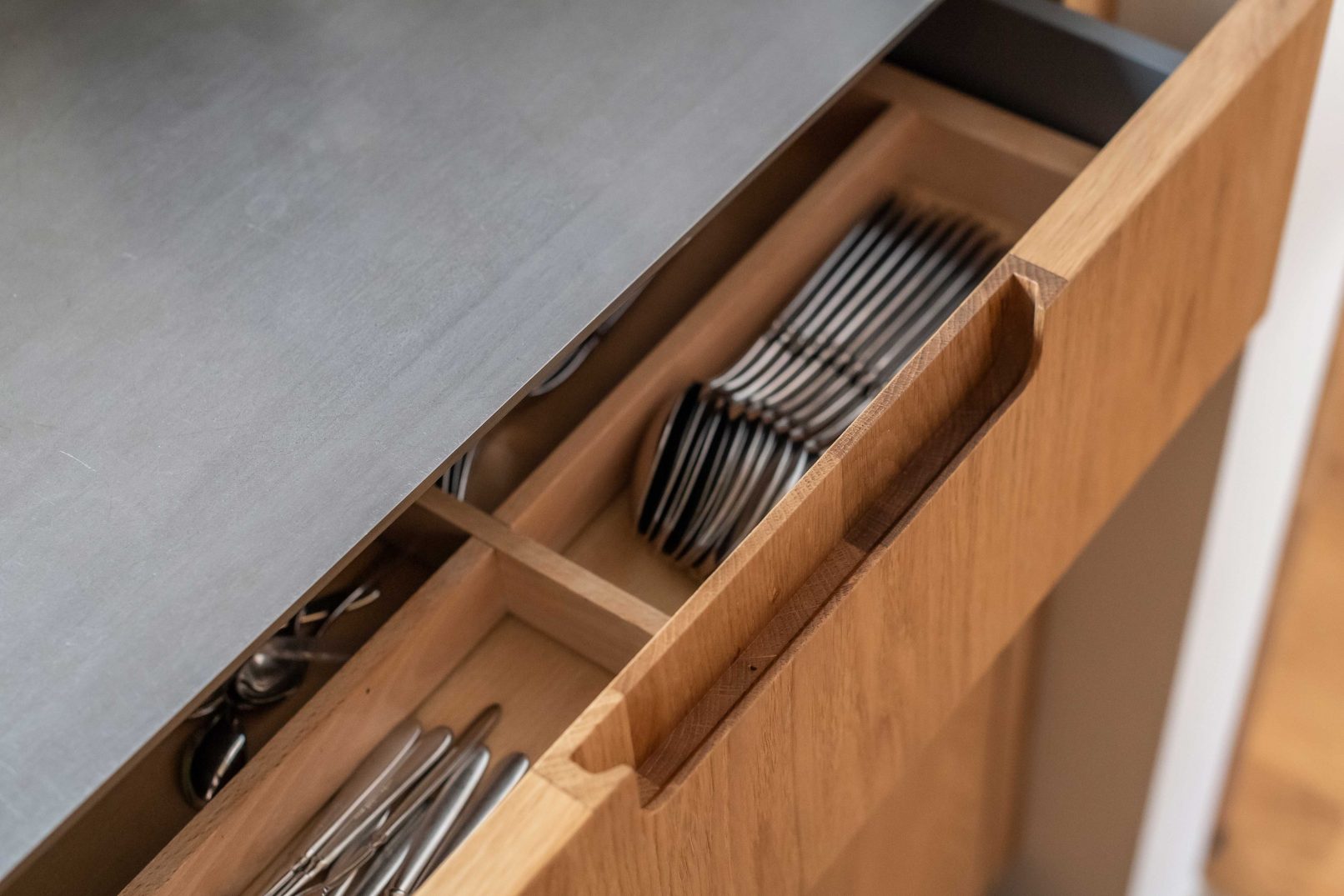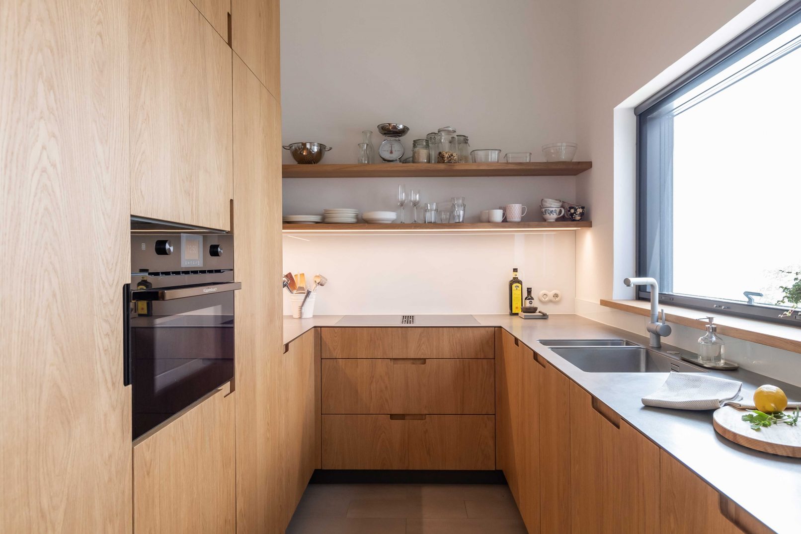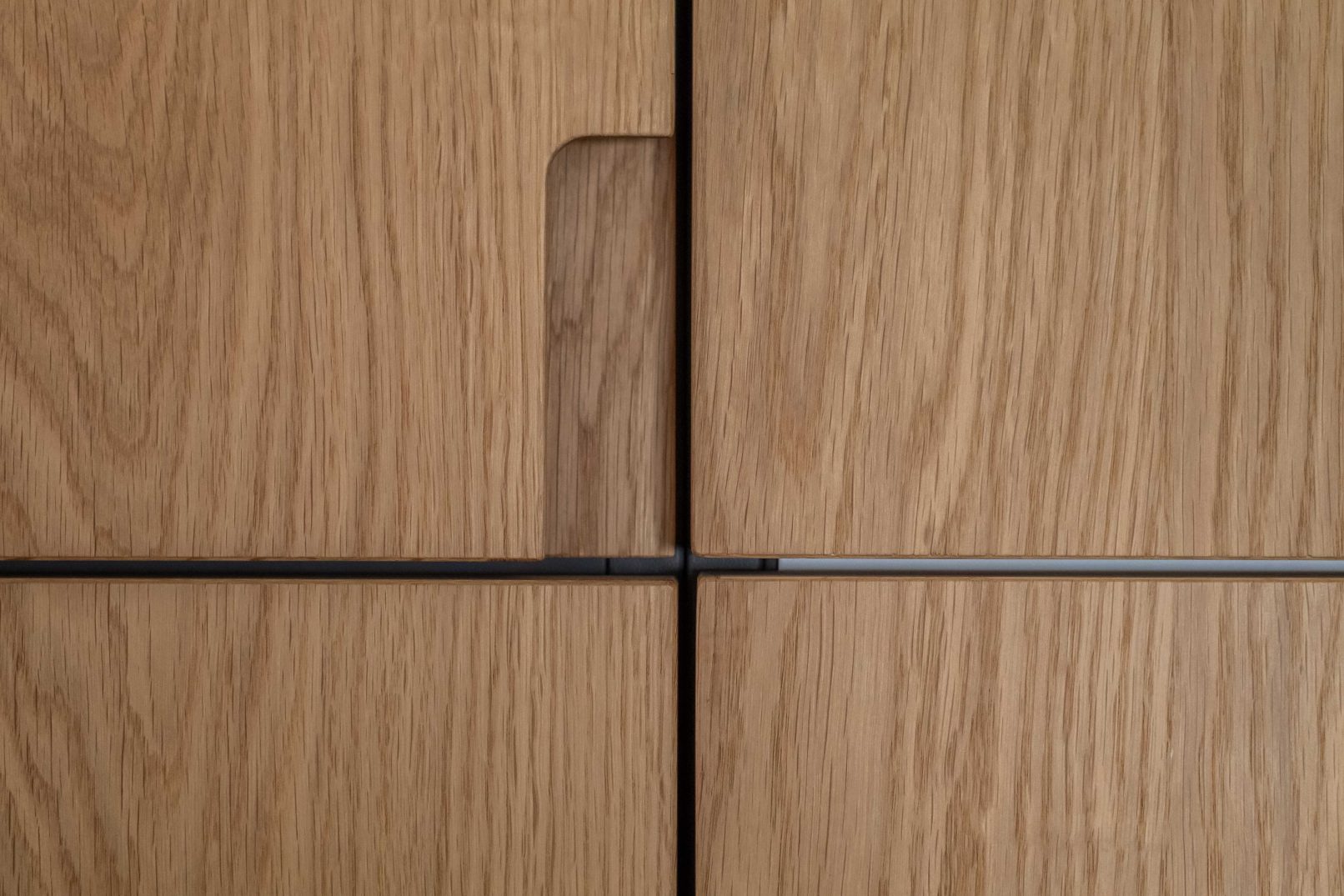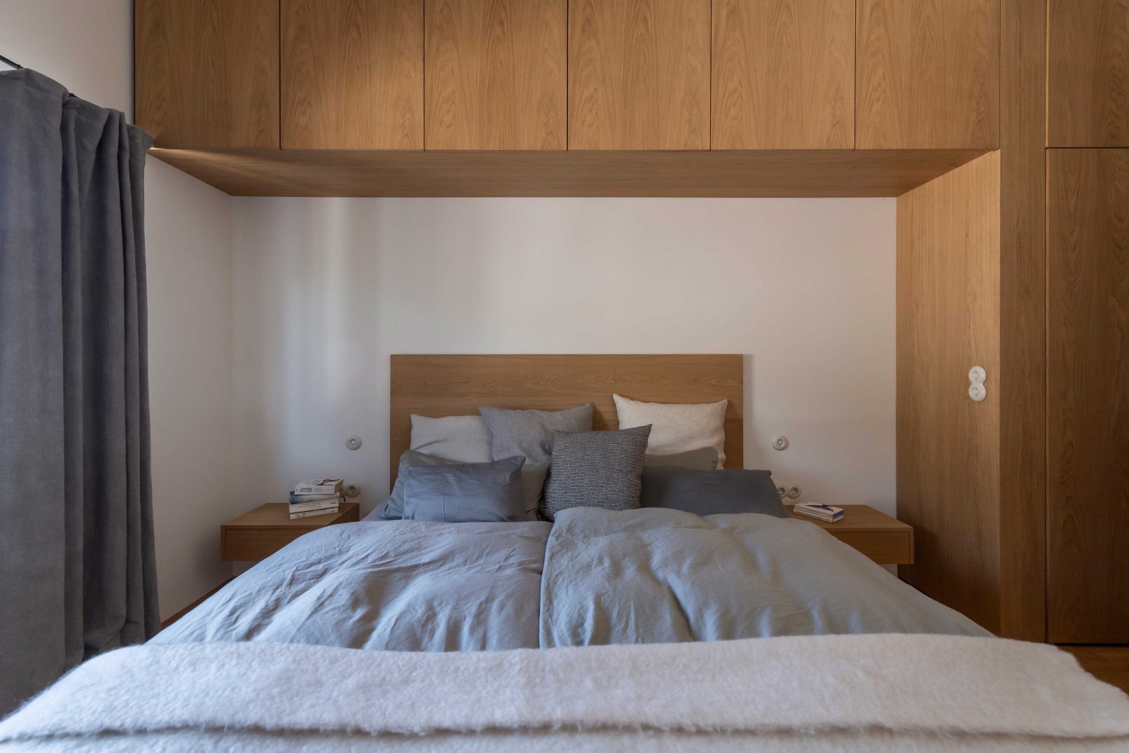 Throughout the entire project, puristic and detailed woodwork blends with the architecture. The oiled oak with a subtle white pigment creates the air of simple elegance, warmth and longevity, and create a soft accent to the otherwise naturally oiled wooden floor. The material use of raw steel on sliding door mounts and curtain poles, as well as the dining table, create a contrast in the unity of the oak wood and introduce a serene liveliness.