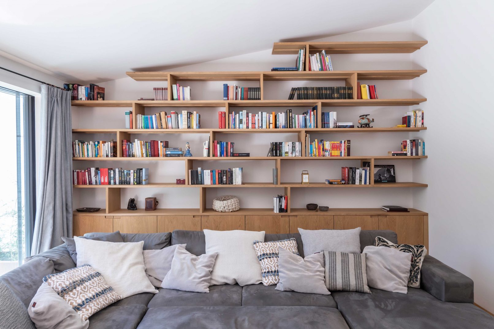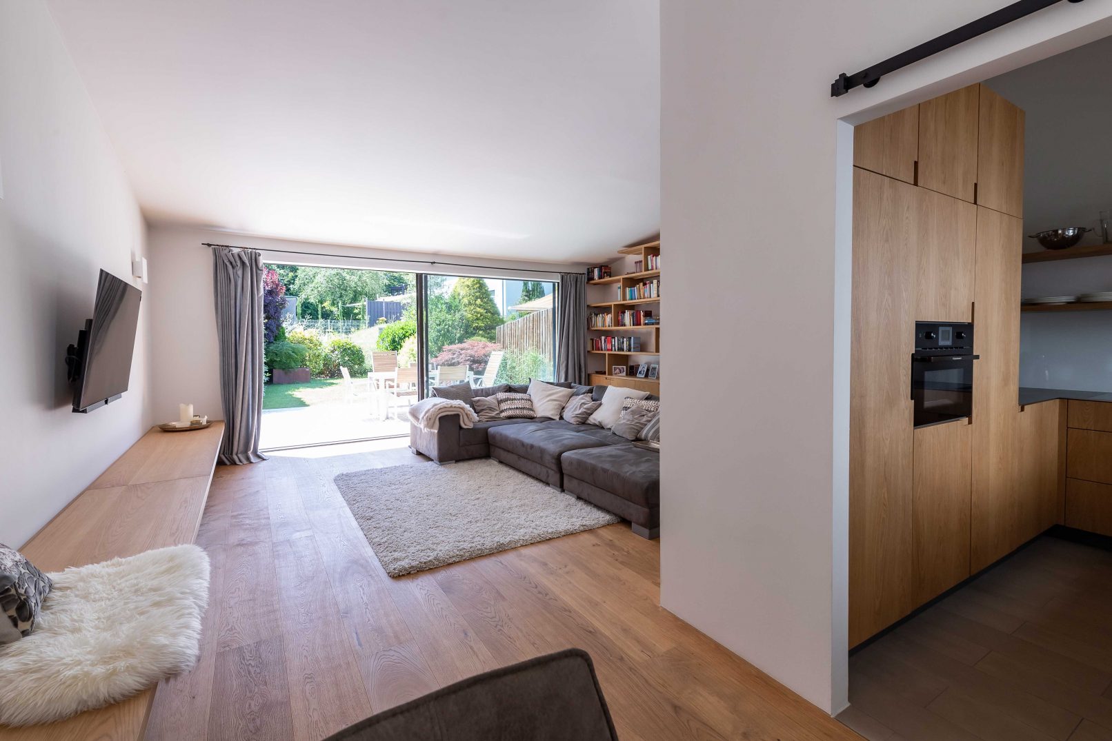 the living area opens up high until right under the ceiling and creates an open and generous impression. the clear and bright effect is being achieved through another glazed frameless sliding door along the entire west side of the house. in order to not interrupt the flow of the floorplan, the terrace outside was being lifted onto the same level of the inside flooring, thus the wooden floor transitions into a stone carpet of travertine tiles in roman pattern. height and width of the living room are being staged by a ceiling-high woodwork shelf.
